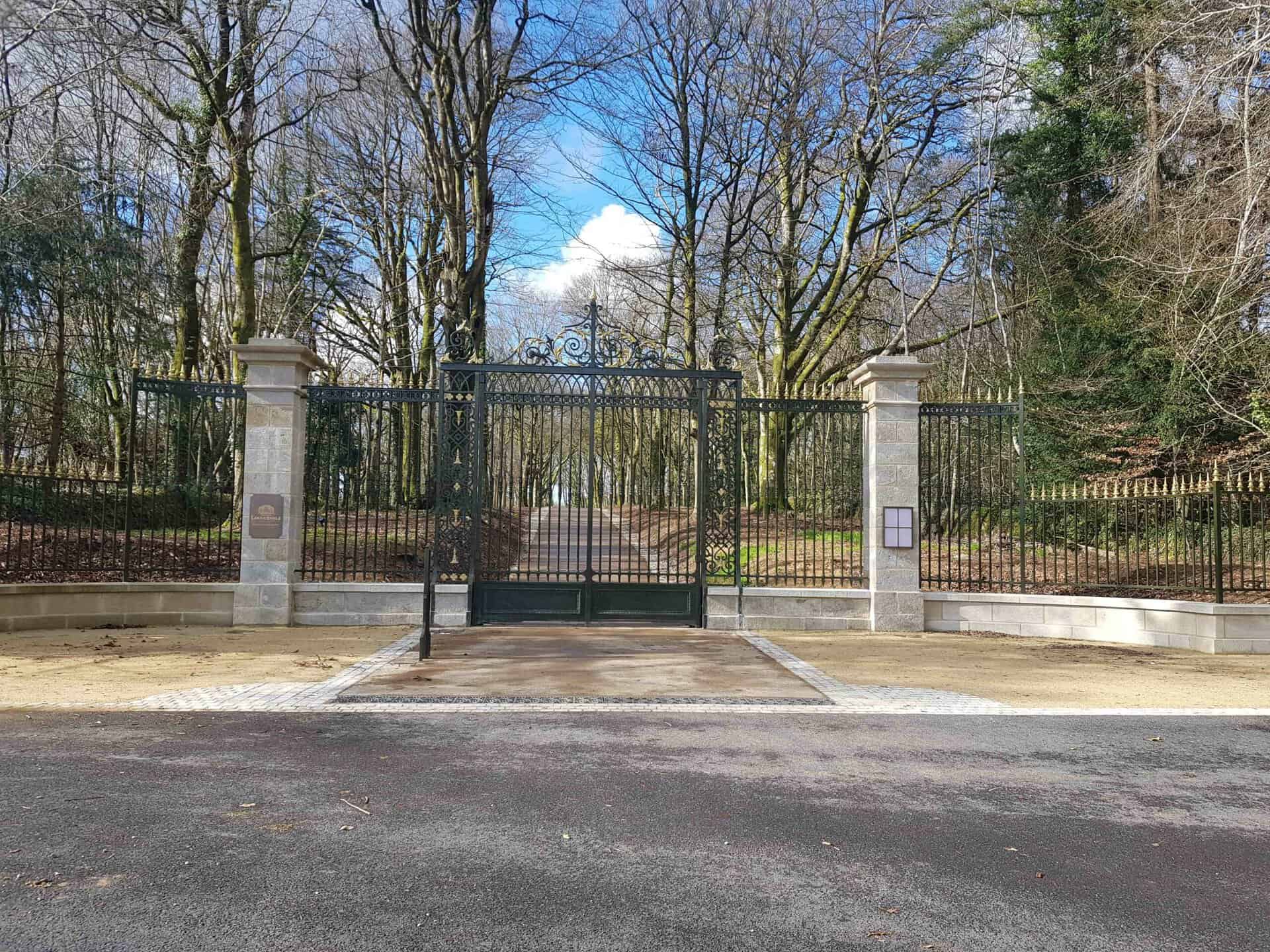 Le portail et les grilles de chaque côté entre les pilastres en pierre ont été restaurés et positionnés à leur nouvel emplacement à l’entrée du domaine. La grille, quant à elle, a été agrandie de chaque côté avec des éléments neufs et le portillon a été mis au rebut.